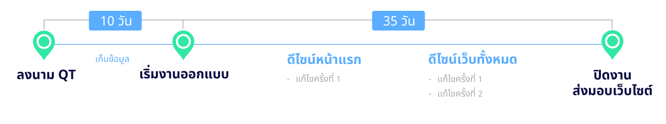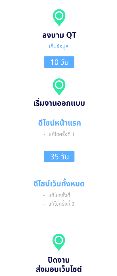 สำหรับเว็บไซต์ขนาดเล็ก (Landing Page) จะใช้เวลาประมาณ 7-14 วัน ส่วนเว็บไซต์บริษัทหรือร้านค้าออนไลน์ทั่วไปจะใช้เวลาประมาณ 3-6 สัปดาห์ ทั้งนี้ขึ้นอยู่กับความพร้อมของข้อมูลจากทางลูกค้าและการตรวจสอบแก้ไขงาน